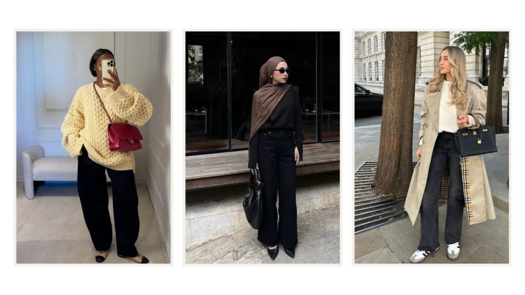 Here’s proof that neutrals can still make a statement. These relaxed black jeans are paired with a beige knit sweater and a structured navy double-breasted coat.