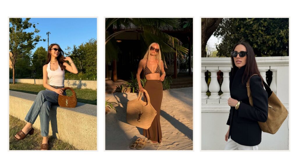 The star of the look is the quilted brown YSL bag with its rounded handle, which ties everything together.